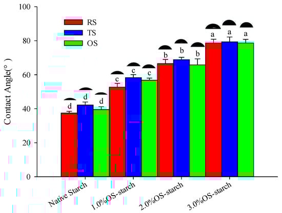 Contact angle of NS and OS-starch. Note: The data means average value (n = 3); the different letters (a–d) means differ significantly (p < 0.05), the same indicates that the difference is not significant (p > 0.05).