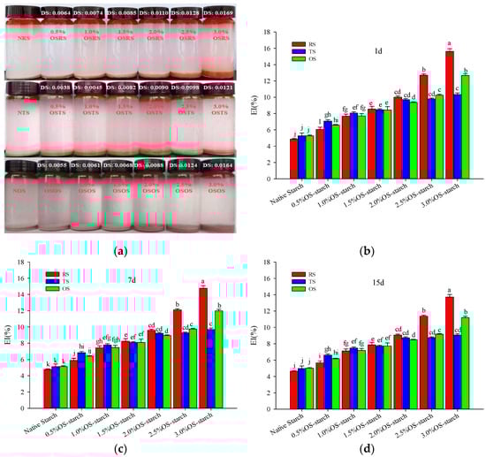 Pickering emulsions prepared from the native starch and OS-starch (a), and the EI values of the emulsions standed for 1 d, 7 d and 15 d (b–d). Note: The data means average value (n = 3); the different letters (a–j) means differ significantly (p < 0.05), the same indicates that the difference is not significant (p > 0.05).