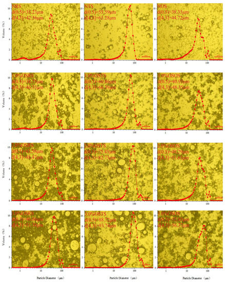 The microstructure of the starch-based Pickering emulsions was observed using a polarized microscope (BS203IP, Chongqing Photoelectric Instrument Co., Ltd., Chongqing, China) and photographed to evaluate the droplet size and distribution state. Each sample was placed on a clean dry microscope slide and covered with a cover slip prior to analysis.