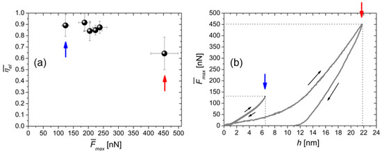 (a) Plot of vs. . (b) Two representative F-h curves taken from the maps recorded respectively at = (120 ± 11) nN and (453 ± 49) nN and corresponding to = (0.891 ± 0.096) and (0.643 ± 0.146), namely the first and last points of the graph in (a). Blue and red arrows are a guide to the eye.