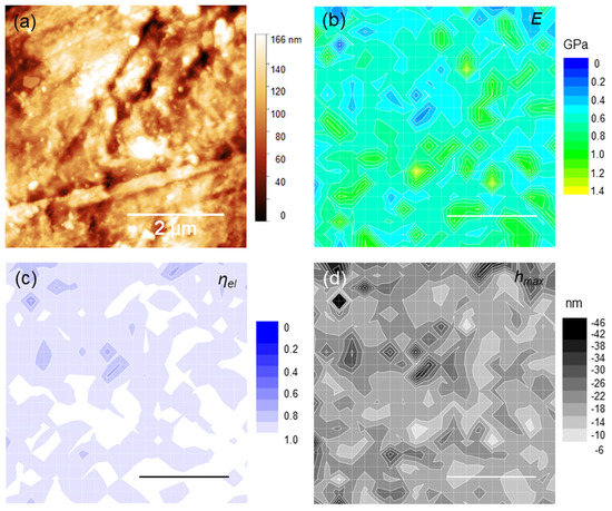 Sample areas 5 × 5 µm2 large were considered for the AFM analysis, based on a preliminary survey of the surface and previous studies [34,40]. In Figure 3a, a topographic image (roughness 15.6 nm, peak-to-peak height 184 nm) is shown along with the corresponding maps of E, ηel and hmax. (Figure 3b–d). By way of example, two features 1 and 2 are evidenced in the topography. These features are separated by a step height of (20 ± 5) nm along the z-axis. At the same positions, two distinct regions or “islands” of localized moduli at ~0.9 GPa can be observed (Figure 3b). Significantly, both the regions exhibited purely elastic response (ηel~0.95), with the same deformation hmax~12 nm (Figure 3c,d). Although similar correspondences between topographies and maps can be observed likewise at different positions, they are—in general- quite elusive. This is the case of Figure 4 (roughness 17.5 nm, peak-to-peak height 166 nm), where several small (<1 µm) islands were detected; remarkably, these islands appear prevalently elastic in nature and correspond to the smallest hmax within the image. Nevertheless, the topographic step heights measured in correspondence of the islands are too small (<5–10 nm) to be significant in relation to the image roughness.
