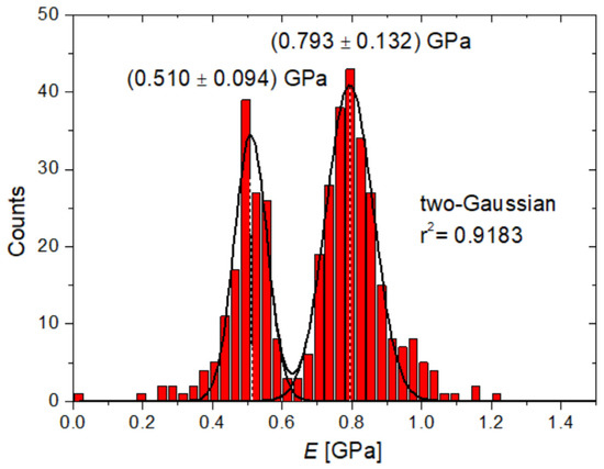 Representative statistical histogram of the moduli extracted from the E map measured at = (187 ± 19) nN, with indication of the corresponding two-Gaussian fitting.