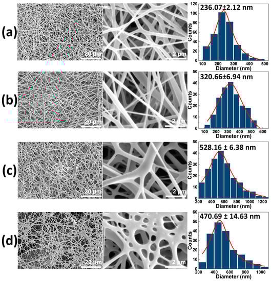 SEM images of (a) PLLA nanofiber, (b) 2.5 wt% CD/PLLA, (c) 5 wt% CD/PLLA, and (d) 10 wt% CD/PLLA nanofibers. The third column represents the histograms of size diameter distribution of the corresponding sample.
