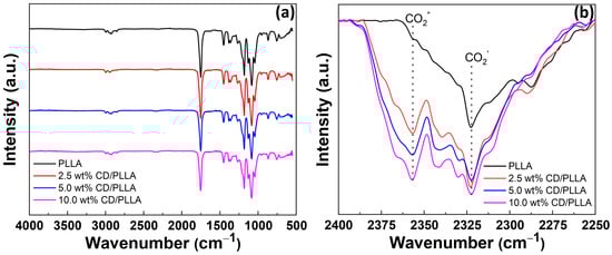 (a) FTIR spectra of electrospun PLLA, 2.5 wt % CD/PLLA, 5 wt% CD/PLLA, and 10 wt% CD/PLLA and (b) Expanded FTIR spectra.
