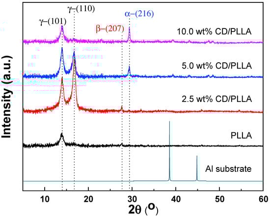 The crystal structure of electrospun PLLA nanofibers was investigated by using the X-ray diffraction technique (XRD). As shown in Figure 3, pure PLLA nanofiber showed a diffraction peak at 13.8°, which represents crystal diffraction at the (101) plane of triclinic (ɣ-phase) PLLA (ɣ(101)) []. This suggests that the orthorhombic gamma phase of PLLA can be formed during the electrospinning process. In addition, a new intense peak located at 16.7°, which refers to the (110) plane of ɣ-phase PLLA (ɣ(110)), was evidently observed when 2.5 wt% of CD was mixed in PLLA []. Furthermore, it was found that the intensity of ɣ(110) was intensively decreased and disappeared when the content of CD was increased from 5 wt% to 10 wt%; meanwhile, the new peak located at 29.4° emerged, which indicates the (216) diffraction plane of α-phase PLLA []. This suggests that CD can induce the crystallization of PLLA from the orthorhombic ɣ-phase to the most stable α-phase of PLLA. Interestingly, the β-phase PLLA located at 27.7° (207) was found in pure PLLA and 2.5 wt% CD/PLLA [,]. This existence of β form crystal conformation of PLLA can contribute to great thermal stability, which corresponds well with DSC results and high piezoelectric or triboelectric properties of a material that can be used to support the PM testing results []. Thus, it can be concluded that the prepared electrospun fibers composed of different crystal phase structures of PLLA, including PLLA (ɣ(101)), 2.5 wt% CD/PLLA (ɣ(101), ɣ(110), β(207)), 5.0 wt% CD/PLLA (ɣ(101), ɣ(110), α(216)), and 10.0 wt% CD/PLLA (ɣ(101), α(216)). From the literature, change in the crystal phase of PLLA could come from various reasons. It was reported that electrospinning of PLLA can result in the metastable β-crystallinity phase []. Additionally, cyclodextrin can act as a nucleating agent by making an inclusion complex with PLLA that leads to an enhanced crystallization rate of PLLA [,]. As seen in the XRD results, incorporating CD can increase the crystallinity of CD/PLLA nanofiber. In the case of 5 and 10% wt CD/PLLA, the data imply that increasing the content of CD may promote the penetration of PLLA chains into the CD that allows rearrangement of PLLA molecule to form more stable and lower energy α-phase.