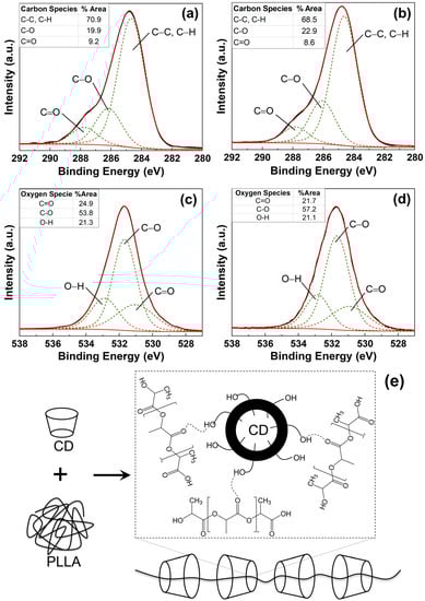 The interaction between PLLA and CD was elucidated by XPS O 1s spectra, as shown in Figure 4c,d. The XPS O 1s spectrum of pure PLLA electrospun fiber can be fitted into three peaks centered at 531.0, 531.7, and 532.9 eV, which could be indexed to C=O, C-O, and O-H, respectively [,]. It was found that the percentage of C-O was significantly increased when CD was integrated into PLLA. This corresponds well with XPS C 1s results, as shown in Figure 4b. Interestingly, the deconvoluted peak at C=O of 2.5 wt% CD/PLLA was red-shifted (from 531.1 to 530.7 eV). This finding implies that the lower electronegativity element interacted with oxygen in C=O bonds. As a result, the electron density around the oxygen atom increases, and the binding energy decreases. Thus, the possible interaction between CD and PLLA is the hydrogen bonding between the carbonyl group of PLLA and the hydroxyl group of CD (C=O- - -H-O), as illustrated in Figure 4e.