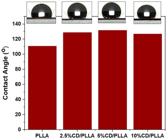 Contact angle of electrospun PLLA compared with 2.5, 5, and 10 wt% CD/PLLA.