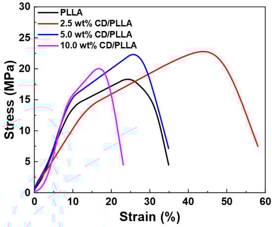 Stress-strain curves of PLLA and CD/PLLA nanofibers.
