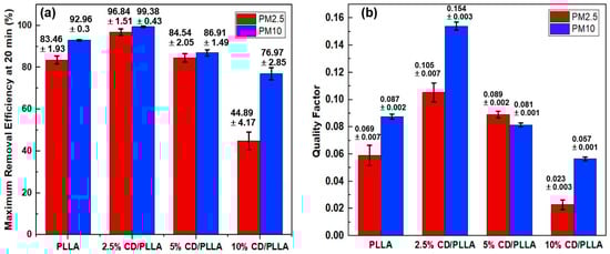 (a) PM2.5 and PM10 removal efficiency and (b) quality factor of PLLA and CD/PLLA nanofibers.