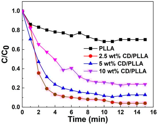 VOC entrapment capability was investigated by using toluene vapor. As evidenced by Figure 9, CD/PLLA nanofibers exhibited higher entrapment of toluene amount than the plain PLLA nanofiber. This result could be explained by the formation of an inclusion complex of toluene in CD. The 2.5 wt% CD/PLLA showed the highest VOC removal efficiency up to 90% within 5 min, followed by 5 wt% CD/PLLA and 10 wt% CD/PLLA. It was found that a higher amount of CD resulted in a lower VOC entrapment. This suggested that the embedded CD moiety in PLLA nanofibers was not equally exposed and accessible to trap toluene.
