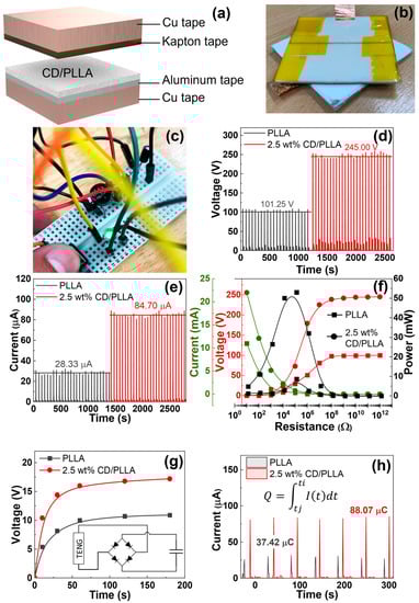 Electrospun PLLA and CD/PLLA mats were cut into 4 × 4 cm2 pieces. The TENG was fabricated in a face-to-face configuration. PLLA or CD/PLLA was attached to aluminum tape and copper tape electrodes, which served as the bottom layer. Kapton film attached with copper tape served as the top layer.