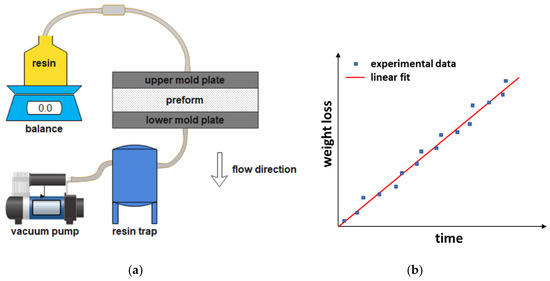 As an alternative to measuring the volumetric permeability, the mass permeability can be measured. Mass flow rate can be obtained from weight measurements, as shown by Lionetto et al. [52], who determined the permeability of three different carbon fiber preforms, made of a balanced fabric, a stitched unidirectional fabric, and a unidirectional one, at different values of fiber volume fraction Vf. Polyethylene glycol 400 (PEG400) was used as a test fluid. The experimental set-up shown in Figure 3a consists of a vessel containing the test fluid positioned on a balance, the mold, and a vacuum pump, to realize a VARI process under constant flow rate and pressure. When the preform is saturated, and all air has been displaced from the flow channels, the steady state condition is achieved, and the quantity of fluid that passes through the thickness of the preform can be measured by the balance.