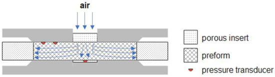 Ultrasonic sensors are generally used for non-destructive evaluation or, more recently, for structural health monitoring [71]. Similarly, they allow non-invasively measuring of both the in-plane and the out-of-plane permeability (embedded sensors or contact between probes and samples are not required). Moreover, resin flow can be monitored without transparent molds and also visualized through opaque reinforcement materials [72]. However, the major limit is still the low thickness of the used preform due to the limited resolution depth of ultrasound in the MHz range.