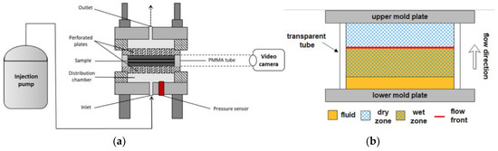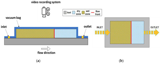 Visual monitoring of the flow front position is generally used to determine in-plane unsaturated permeability and is one of the most used methods, as it requires only a transparent mold and a video camera to record the flow front evolution during infusion. The injection can be either linear or radial. Lionetto et al. [57] calculated the in-plane permeability of two types of unidirectional carbon fiber fabrics with polyethylene glycol 400 (PEG400) as a test fluid. The experimental set-up is sketched in Figure 5a. The transparent vacuum bag, used for the resin infusion process, enables one to visualize the flow front during infusion, recorded by a video camera, as shown in Figure 5b. A flat flow front must be observed in the absence of low permeability fluid bypass paths, which can alter the measurement.