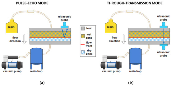 Longitudinal waves are waves characterized by the same direction of particle motion and wave propagation. Two different methods are based on longitudinal waves, the pulse-echo mode, where a single probe works simultaneously as emitter and receiver, and the through-transmission mode, where two probes are needed (Figure 7) [73]. Lionetto et al. [52] estimated the out-of-plane permeability of three carbon fiber preforms by using the pulse-echo mode. The ultrasonic waves generated by the probe were reflected at the air-fluid interface and returned to the probe. The distance between the flow front and the transducer was calculated from the time-of-flight Δt (s) of the reflected echo: