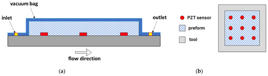 (a) Experimental set-up and (b) sketched cross-section of PZT sensors-based flow front monitoring (adapted from Liu et al. [78]).