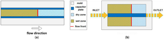 Capacitive sensors are based on the change in capacitance of the reinforcement when it is impregnated with the liquid resin. Qi et al. [80] measured the unsaturated in-plane permeability of two glass fiber preforms. They used an epoxy resin as a test fluid, a transparent polymethyl methacrylate (PMMA) mold to visualize the resin flow front, and a parallel-plate capacitor composed of two copper foil tapes 1.5 cm wide and of the same length of the mold (Figure 9a). During infusion, two biphasic regions are present, a wet and a dry zone (Figure 9b), both contributing to the total capacitance C (F) between the two armatures of the capacitor, given by the following equation: