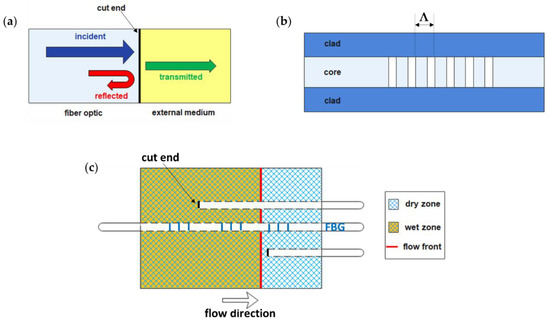 (a) Sensing principle of fiber optics based on Fresnel law (adapted from Chehura et al. [96]), (b) a sketch of the Fiber Bragg Grating structure, and (c) an example of embedded fiber optics application for flow front monitoring.