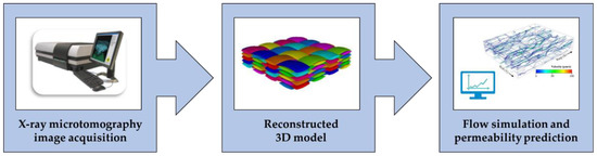 After tomographic image acquisition by micro-CT, a 3D model can be reconstructed, which represents the realistic domain for resin flow simulation, and permeability is predicted by numerically solving the governing equations of fluid dynamics.