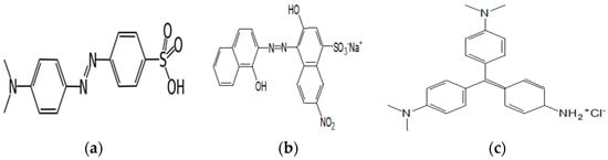 Chemical structure of (a) Hélianthin, (b) Eriochrom black T, (c) methyl violet.