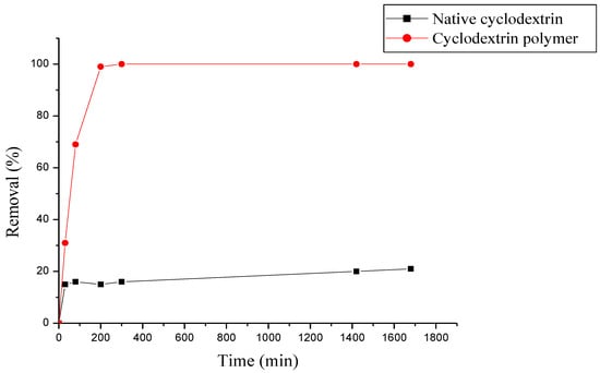 Comparison study of methyl purple removal with native β-cyclodextrin and β-cyclodextrin polymer, T = 30 °C.