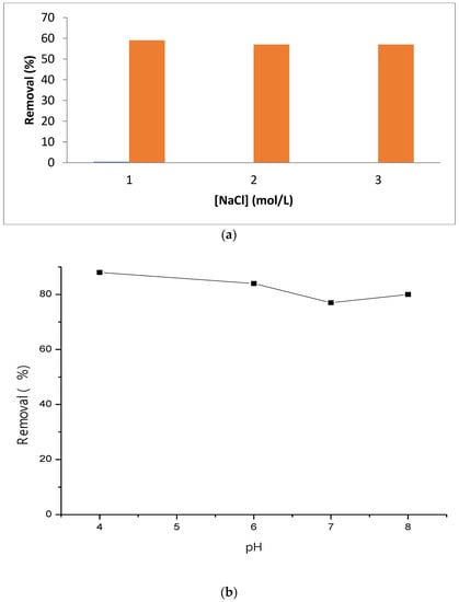 (a) ionic strength, (b) Effect of pH on methyl violet removal by ß-cyclodextrin polymer, T = 30 °C.