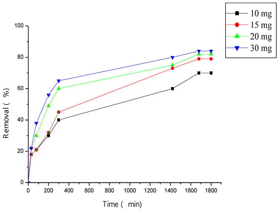 The effect of adsorbent amount on methyl violet adsorption is represented in Figure 7, the efficiently increases with increase in adsorbent amount and the equilibrium is attained at 1700 min.