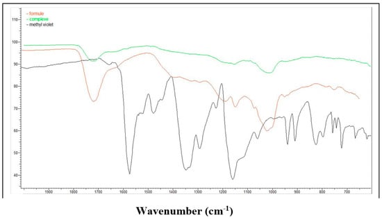 The FTIR spectra (500–4000 cm−1) of methyl violet and β-cyclodextrin polymer before and after adsorption are represented in Figure 11. The peak at 1500 cm−1 and 1600 cm−1 is attributed to the vibration of aromatic C = C bond, and the peak at 1200 cm−1 and 1300 cm−1 is attributed to the vibration of aromatic amine bond in methyl violet spectra.