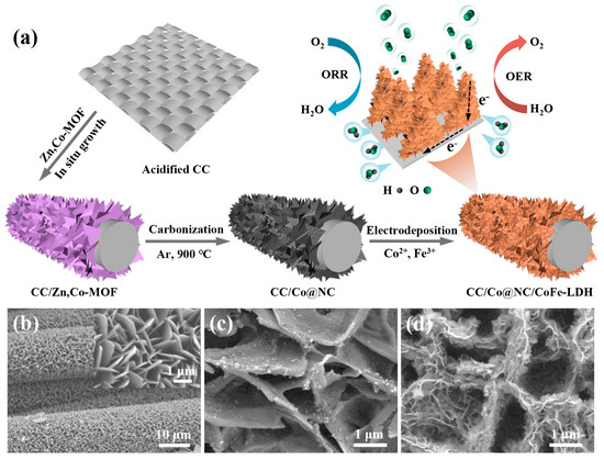 (a) Schematic diagram depicting the synthesis process of CC/Co@NC/CoFe-LDH. SEM images of (b) CC/Zn, Co-MOF, (c) CC/Co@NC, and (d) CC/Co@NC/CoFe-LDH-700.