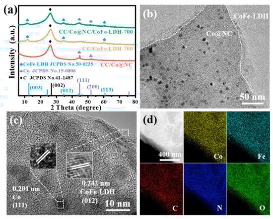 The compositions and crystalline phases of CC/Co@NC, CC/CoFe-LDH-700, and CC/Co@NC/CoFe-LDH-700 were identified using XRD measurements. As presented in Figure 2a, the characteristic peak located at about 26.5° belongs to the (002) plane of graphitic carbon from Co@NC and CC substrate (JCPDS No.41-1487) [45]. Meanwhile, the diffraction peaks appearing at 44.2° and 51.5° in CC/Co@NC match well with the (111) and (200) planes of metallic Co (JCPDS No.15-0806), deriving from the Co nanoparticles obtained by the carbonization of the Zn, Co-MOFs [27]. For the CC/Co@NC/CoFe-LDH-700, the additional peaks at 11.6°, 34.0°, and 60.5° correspond to the (003), (012), and (113) planes of CoFe-LDH, while the similar peaks can be observed in CC/CoFe-LDH-700 [33]. TEM image verifies that Co nanoparticles with an average size of about 10 nm and ultrathin CoFe-LDH nanosheets were decorated on the surface of MOF-derived carbon nanoflakes (Figure 2b). Especially, the clear lattice fringes with distances of 0.201 and 0.242 nm are observed in the high-resolution TEM (HRTEM) image (Figure 2c), corresponding well to Co (111) and CoFe-LDH (012) planes, respectively [41,46]. The co-existence of Co@NC and CoFe-LDH enables the good ORR and OER activities of catalysts, while the effective contact of the two phases is beneficial to enhance electron transport and catalytic stability through a “synergistic effect” [40]. Moreover, the agglomeration of Co is found to occur when Co-MOF was carbonized at high temperature, resulting in large Co nanoparticles with uneven distribution (Figure S3), which is in sharp contrast to the small and uniformly dispersed nanoparticles derived from bimetallic MOFs. The results indicate that the steric barrier effect of Zn species can effectively suppress Co sintering during pyrolysis [31]. In addition, the elemental mapping images in Figure 2d illustrate the homogeneous distribution of Co, Fe, C, N, and O elements in the detection region of the heterostructure Co@NC/CoFe-LDH.