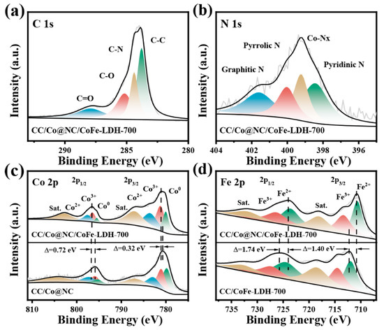 The valance state and electron interaction of the constituting elements in CC/Co@NC/CoFe-LDH-700 were further investigated by XPS. It can be seen from the XPS full spectra in Figure S4 that there are mainly C, N, Co, Fe, and O elements in the CC/Co@NC/CoFe-LDH-700, agreeing with the element scanning results [47,48,49]. In Figure 3a, the high-resolution C 1s spectra was deconvolved into four different functional carbons, corresponding to C-C at 283.8 eV, C-N at 284.4 eV, C-O at 285.2 eV, and C=O at 287.9 eV, respectively. The C-N bond suggests the successful doping of N atoms in the carbon framework, while the C-C bond indicates the presence of graphitic carbon [11]. The N 1s spectra shown in Figure 3b was then divided into four kinds of N species, containing pyridinic N (398.4 eV), Co-Nx (399.2 eV), pyrrolic N (400.0 eV), and graphitic N (401.6 eV). Studies have shown that most of the N bonding configurations, except for N-oxide, contribute to the electrocatalytic activity, for example, pyridinic N boosts the adsorption of oxygen species, and graphitic N enhances the conductivity [50]. In particular, Co-Nx can serve as a highly active center for ORR in electrocatalysts [51]. Figure 3c presents the Co 2p spectra for CC/Co@NC/CoFe-LDH-700 and CC/Co@NC, two prominent peaks located at 780.8 eV and 796.5 eV correspond to Co 2p3/2 and Co 2p1/2, while the subsequent peaks at 787.0 eV and 802.7 eV can be attributed to the satellite peaks (identified as Sat.) of Co 2p3/2 and Co 2p1/2, respectively, implying the co-existence of the Co2+ and Co3+ species [29]. Moreover, the deconvoluted peaks of 779.9 eV and 795.5 eV are assigned to Co0, confirming the presence of metal Co, which is consistent with the results of XRD and TEM [52]. The Fe 2p spectrum of CC/Co@NC/CoFe-LDH-700 in Figure 3d shows Fe 2p3/2 and Fe 2p1/2 characteristic peaks at 710.8 eV and 724.1 eV, which can be fitted into four peaks of Fe3+ (713.3 eV and 726.3 eV) and Fe2+ (710.6 eV and 723.6 eV), accompanied by two satellite peaks (718.0 eV and 731.9 eV) [38]. Impressively, it can be seen that Co 2p in CC/Co@NC/CoFe-LDH-700 has a significant positive shift compared with CC/Co@NC, meanwhile, Fe 2p in CC/Co@NC/CoFe-LDH-700 shifts negatively relative to CC/CoFe-LDH-700, which is caused by interfacial interaction between the Co@NC and CoFe-LDH [53]. It has been demonstrated that this strong interaction results from the partial electron transfer from Co@NC to CoFe-LDH, which helps to regulate the redox behavior of Co and Fe cations, thus generating the active phase in the electrochemical process [43,54]. In addition, the interfacial electron interaction between the Co@NC and CoFe-LDH is essential for rapid charge transfer, which can be verified by the follow-up electrochemical tests.