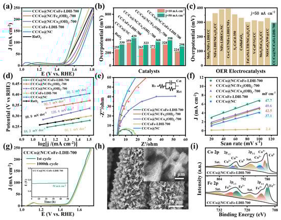The electrocatalytic OER performance of CC/Co@NC/CoFe-LDH-700 and other contrast samples was first evaluated by LSV measurements in 1.0 M KOH solution. As seen in Figure 4a,b, CC/Co@NC/CoFe-LDH-700 exhibits excellent OER catalytic activity, requiring only the overpotential of 224 and 298 mV to obtain the current density of 10 and 50 mA cm−2 (η10 = 224 mV, η50 = 298 mV) without IR correction, which are smaller than these of CC/Co@NC (359, 429 mV), CC/CoFe-LDH-700 (263, 323 mV), CC/Co@NC/Cox(OH)y-700 (272, 368 mV), CC/Co@NC/Fex(OH)y-700 (328, 398 mV), and even commercial RuO2 (255, 330 mV), respectively. It is worth noting that the effect of CoFe-LDH nanosheets with different electrodeposition times on the OER performance of CC/Co@NC/CoFe-LDH was also investigated, and it was found that the catalyst with an electrodeposition time of 700 s shows the lowest overpotential at 50 mA cm−2 (Figure S5). This is because a short electrodeposition time will result in the low loading of CoFe-LDH nanosheets, while a long time will lead to the accumulation of CoFe-LDH nanosheets and hinder mass transport [41]. Only proper electrodeposition time can ensure abundant catalytic active sites and efficient mass exchange in the catalyst. Moreover, the OER catalytic activity (overpotentials at the current density of 50 mA cm−2) of CC/Co@NC/CoFe-LDH-700 is superior to most reported conventional LDHs and many other similar recently reported high-performance OER catalysts (Figure 4c and Table S2).