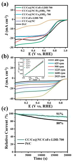 In addition to OER performance, the ORR activity and stability of CC/Co@NC/CoFe-LDH-700 was also assessed in 0.1 M KOH solution. The CV tests in Figure S7 show that the CC/Co@NC/CoFe-LDH-700 exhibits a typical oxygen reduction peak in the O2-saturated electrolyte, whereas this reduction peak is not observed in the N2-saturated solution, signifying remarkable ORR performance. The same result can be obtained by the rotating disk electrode (RDE) measurements, as presented in Figure 5a. Compared with other comparative samples, the CC/Co@NC/CoFe-LDH-700 electrode displays a higher onset potential (E0, 0.83 V), half-wave potential (E1/2, 0.69 V) and larger limiting current density (Jlim, 29.0 mA cm−2), even comparable to Pt/C (E0 = 0.92 V, E1/2 = 0.76 V and Jlim = 21.3 mA cm−2) and recently reported catalyst on the carbon cloth substrate (Table S3). This excellent ORR performance is mainly attributed to the active site provided by Co@NC and the synergistic effect with CoFe-LDH interaction, while the presence of Zn species in MOF contributes to the uniform distribution of Co nanoparticles and effectively promotes the ORR performance (Figure S8) [30,31]. Similarly, we also explored the influence of different electrodeposition times (500, 700, and 900 s) on the ORR performance of CC/Co@NC/CoFe-LDH. It can be seen from Figure S9 that the electrodeposition time has little effect on the ORR performance. To gain insight into the ORR mechanism, the polarization LSV curves at different rotation speeds and corresponding K–L plots were carried out. As illustrated in Figure 5b, the limiting current density of CC/Co@NC/CoFe-LDH-700 is ascended as the rotation speed increases from 400 to 2025 rpm, indicating that the reaction process is kinetically controlled. The fitted K–L plots (the inset of Figure 5b) display a good linearity relationship, suggesting first-order reaction kinetics for dissolved oxygen. Furthermore, the average electron transfer number (n) of CC/Co@NC/CoFe-LDH-700 was calculated to be about four according to the K-L equation, demonstrating a nearly 4-electron transfer pathway in the ORR process. Chronoamperometric tests were then performed to investigate the stability (Figure 5c). The CC/Co@NC/CoFe-LDH-700 catalyst shows robust long-term durability with a current retention of 91% after 20,000 s of continuous operation, while that of Pt/C decreases to 80%.