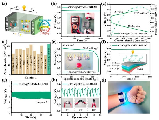 Electrochemical performance of ZABs with CC/Co@NC/CoFe-LDH-700 as the air cathode. (a) Schematic diagram of a liquid ZAB. (b) Open-circuit voltage measurement of the liquid ZAB. (c) Charge-discharge polarization curves and corresponding power density plot. (d) Performance comparison of liquid ZABs based on different air cathodes. (e) Specific capacity curve. (f) The open-circuit plot and the inset show a schematic illustration of a solid-state ZAB. (g) Galvanostatic cycling curve at 2 mA cm−2. (h) Cycling stability under different bending angles. (i) Photograph shows the application of wearable and flexible ZABs.