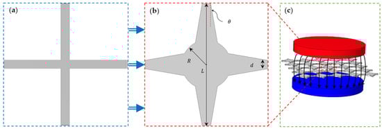 Unit cell geometrical parameters play an important role in the dynamic behaviour and wave-propagation properties of periodic structures. It has been shown that the conventional square lattice unit cell (Figure 1a) is not able to attain a bandgap area in low-frequency vibrations, partly due to mean node connectivity [] and balanced mass spread in all areas of the unit cell []. As represented by Sepehri et al. [], the mean connectivity issue may be addressed by adding more beams and nodes to the basic unit cells due to the hierarchy of conventional structures like square and hexagon. However, this poses some limitations in the fabrication of these metamaterials. Here, in this study, distribution of the mass inside the MRE-based unit cell has been altered to develop adaptive periodic structures (with variable bandgap areas). Figure 1b shows the proposed MRE-based cross-shaped unit cell, including a cylindrical core and trapezoidal arms. Important geometrical parameters affecting bandgap areas are shown in this figure. The dynamic properties of the proposed adaptive unit cell can be effectively varied using the magnetic stimuli shown in Figure 1c.