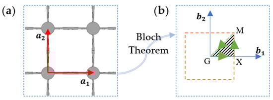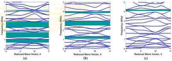 where , and are the components of the direct vectors , , and along the x-, y-, and z- directions, respectively. Using reciprocal space, also called k-space, allows representing the Fourier transform of the spatial function (in real space) with respect to spatial frequencies (wave vector numbers ,). One of the main parts of the wave propagation analysis is finding the relation between the free wave motion frequency and its associated wavenumbers (,), known as a dispersion relation. The dispersion relation should be obtained in the first Brillouin zone (FBZ), in which the Brillouin zone is the unit cell in the reciprocal space [], as shown in Figure 2b. This allows to formulate the relation between the frequencies and wavenumber. The FBZ and IBZ (irreducible Brillouin zone) of the square unit cells in reciprocal space are shown in Figure 2b. It is noted that due to the symmetry of FBZ, the IBZ is the smallest domain necessary to solve the dispersion relation. Based on the Bloch theorem, the wave vectors are restricted to the edges of the IBZ, shown by the hatched region in Figure 2b. The high-symmetry points (G–X–M) are calculated from the reciprocal space vectors and FBZ area due to the symmetries of the primitive unit cell. Thus, the ranges of the phase constant (i.e., imaginary part of the wave vector) of are , , and in the G–X, X–M, and M–G directions, respectively.