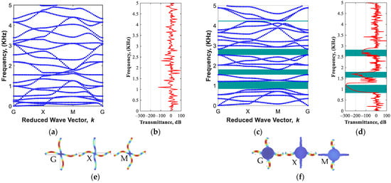 The generation of the new bandgaps is in-part due to the fact that the elements of the modified unit cell have natural frequencies within the specified range, causing local resonance bandgap areas. The conventional periodic model can be considered a periodic mass-spring model in two directions (x,y), with uniform constant mass distribution. Thus, by adding a cylindrical mass in the core of the unit cell and changing the arm angle, the mass distribution over the unit cell will no longer be constant. In order to verify added bandgap areas, the finite-period transmission spectrums are evaluated in Figure 1a,b for the conventional periodic square lattice and the proposed periodic structure with cylindrical core and trapezoidal arms, respectively. Results show a perfect agreement between bandgap areas (highlighted green areas) and sharp drops in the transmission spectrum. Amin et al. [] also reported that variable mass distribution in the unit cell enables the development of bandgap areas (splitting specific branches in the wave propagation diagram). This can be further realized by comparing the sixth mode shapes of the conventional and modified lattices in various high symmetry points, as shown in Figure 3e,f, respectively. It is interesting to note that the proposed modified unit cell enables more band gap areas through the periodic model without changing the dimensions of the unit cell (i.e., or ). This allows to design novel periodic structures with maximum bandgap regions.