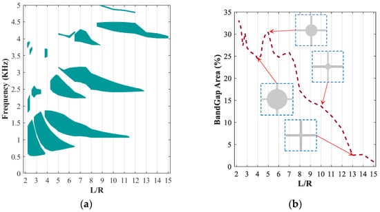 To better understand the effect of core radius, results for bandgap frequency range and percentage of covered bandgap areas within the frequency range are provided for ratio ranging from 2 to 15, as shown in Figure 5a,b, respectively. As illustrated in Figure 5a, the modified periodic structure with different added cylindrical masses has various wave propagation behaviours. This provided an opportunity to generate a filtering area in multiple frequency ranges. Examination of results in Figure 5a reveals that filtering vibrations in the low-frequency range of are achievable with periodic arrays of the square lattice with a relatively large radius (). Results also show that periodic architected structures with lower radii () are only able to have high-frequency filtering in frequencies above .
