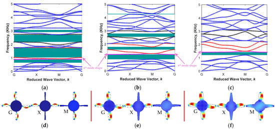 For further examination, let us focus on the first band gap on the basis of the local resonance phenomenon. As depicted in Figure 6d–f (i.e., mode shapes of the modified structure), the trapezoidal arms vibrate without any changes in the position of the cylindrical mass. This can also be realized from the steadiness of the branch on the upper side of the proposed band gap (Purple line, associated with the local 6th model shape). Except for the high symmetric point of M, which has phonon-phonon scattering because of veering in the dispersion curves, the rest of the branch is a straight line indicating the local resonance [].