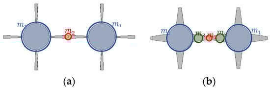Changing the angle of trapezoidal arms affects the mass distribution along the unit cell. Low negative angle of the arms in the periodic model of the unit cells is more likely to be represented by the two lumped masses with a long distance between them represented by the soft spring, whereas for high positive angles ) of the arm, based on the concentration of the mass distribution, it may be represented by three masses with shorter distances (stiff springs), as shown in Figure 7.