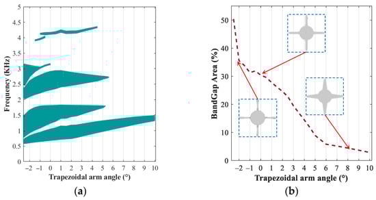 Evolution of bandgap areas in different arm angles () in the fixed cylindrical core radius of and iron volume fraction of 13.94%: (a) bandgap area; (b) percent of bandgap area in the range of and .