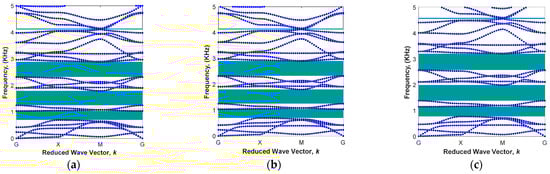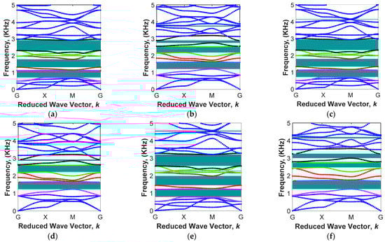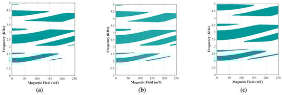 This unequal variation in frequencies associated with different mode shapes under various magnetic fields is not always the cause of the elimination of band gaps in periodic structures. For instance, the 9th and 10th branches of the band diagrams (coloured green) generate a stop band area by increasing the magnetic field, as shown in Figure 11c,d (). It can be realized that the start point of these branches varies from and to and , respectively, by increasing the magnetic flux density from to .
