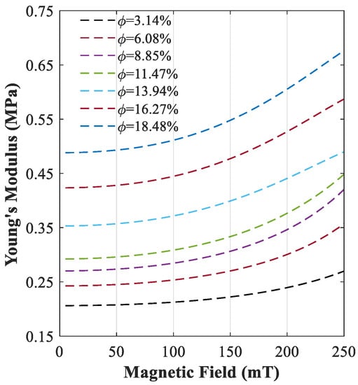 The modulus of the magnetorheological elastomers (MREs) can be adaptively varied through variation of an external magnetic field. This unique adaptive behaviour can be better realized in Figure 10, which shows the variation of Young’s modulus of MREs with respect to the applied magnetic flux density for various iron volume fractions provided in Table 1. As it can be realized, the difference between Young’s Modulus under lower and higher magnetic fields increases by increasing the iron volume fraction. In other words, the dependency of Young’s Modulus on the magnetic field in MREs with higher volume fractions is more pronounced.