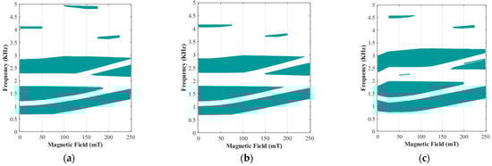 Similar to the previous configuration ( and , results for the variation of the bandgap frequency areas with respect to the applied magnetic flux density for the current configuration ( & ) are shown in Figure 14. Examination of results reveals that this configuration shows nearly the same bandgap behaviour for MREs with and , although the continuity of the band gaps for the higher iron volume fractions is more than that of lower iron volume fraction. Although the lower volume fractions have the same behaviour, and it is possible to use them in some band gap areas, as shown in Figure 14, this configuration depicts better performance with higher volume fractions. As shown in Figure 14c, this unit cell with a volume fraction of provide wide band gap in low frequencies (available until ) and it can cover more areas in higher frequencies above compared with those with lower iron volume fraction.