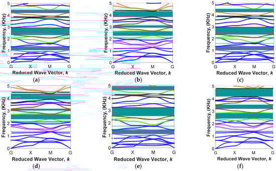 As illustrated in Figure 12, MRE-based periodic structures with and and various iron volume fraction have low-frequency filtering areas with barely wide band gaps higher than . To investigate the behaviour of MRE-based periodic structure with bandgaps at higher frequencies, the wave propagation analysis has also been conducted on an MRE unit cell with the cylindrical core radius of and the arm angle of . Results for band diagrams are depicted in Figure 13. It is noted that this periodic structure has low-, mid-, and high-frequency band gaps, which are easily tunable through variations of the magnetic field. Similar to Figure 11, the specific branches of band structures are marked with different colours in order to study their variation under various iron volume fractions and applied magnetic fields. For instance, in the design with an iron volume fraction of , the first band gap area (between two purpole branches) is easily tunable and can be eliminated by increasing the magnetic flux. Additionally, this specified configuration of the unit cell is able to have more band gap areas under low magnetic flux densities. As depicted in Figure 13a,c,e, under , there are six stop band areas, regardless of the volume of iron fractions. These bandgap areas are listed in Table 3: