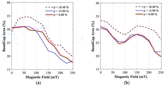 The results for the other configuration of the periodic unit cell ( and ) are also shown in Figure 15b. Again, results confirm a higher bandgap area for the MRE unit cell with a high-volume fraction () through the entire range of the induced magnetic flux density. MRE unit cells with iron volume fractions of 6.08% and 13.94% almost show the same percentage of bandgap area through the entire magnetic flux range, as confirmed before. In contrast to the MRE unit cell with geometrical parameters of and , the MRE unit cell with and shows a higher percentage of bandgap area in the absence of the magnetic field. Based on the results shown in Figure 15b, the bandgap percentage area initially declines as the flux density increases up to nearly 75 mT, then increases by increasing the flux density reaching a peak value around 150 mT and then again declines for flux densities above 150 mT.