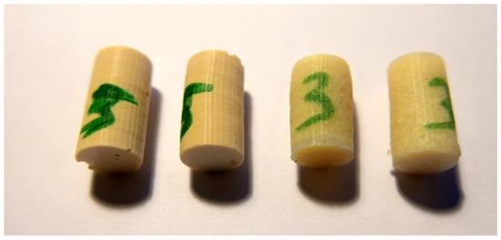 The samples for compressive testing were made by means of a gravity casting method using MM922 silicone. The diameter of the samples equaled 14 mm, whereas the height was 26 mm (Figure 1). The amount of each batch amounted to five.