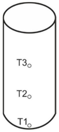 It was assumed that when using a thermoelectric thermometer, temperature would be determined at three heights: at mid-height, at ¼ height and at the bottom of the sample. The diagram of distributing the thermocouples is shown in Figure 2.