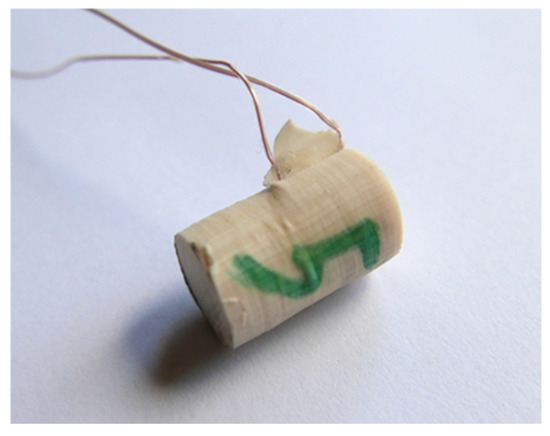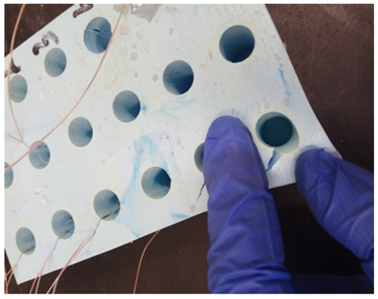 The prepared silicone mold allowed for a single casting of 18 compression specimens with a diameter of 11.6 mm and a height of 25 mm. In each of the 18 specimen holes, incisions were made with a bookbinder’s knife (Figure 3) to insert the thermocouples and ensure their attachment during casting of the specimens from the prepared adhesive compositions.