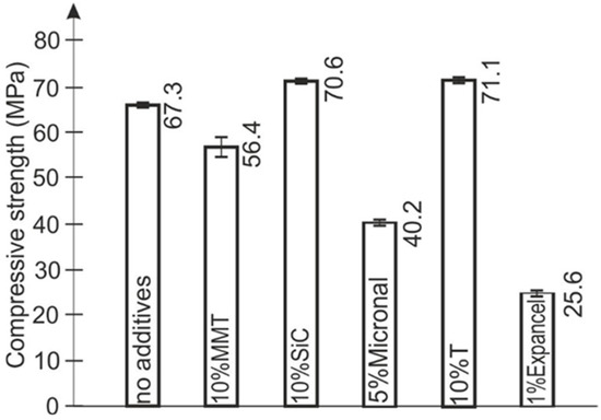 Powder additives, in most cases, caused a decrease in Young’s modulus values, even by more than 50% compared to the unmodified composition (Figure 4). Only the addition of 10% silicon carbide resulted in an increase of the Young’s modulus value.